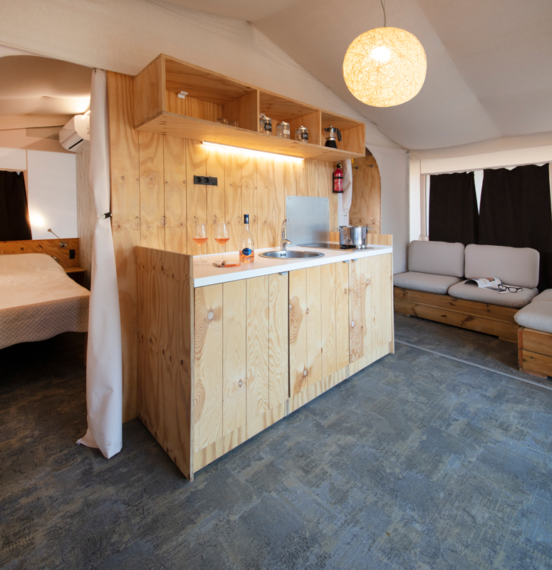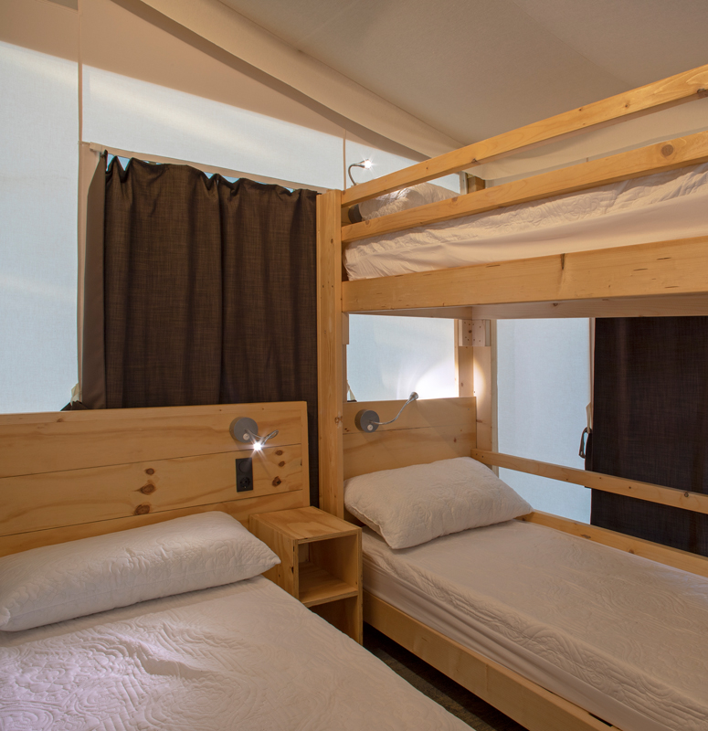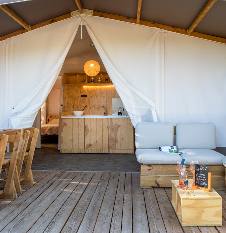 CASSIOPEA per un soggiorno “Stellare”!! Studiata per ospitare fino a 5 persone, la nuova tenda CASSIOPEA ha una struttura confortevole e funzionale. Nella parte anteriore la struttura si sviluppa, per tutta la larghezza. La zona giorno con angolo cucina è costituita da un unico grande ambiente con ampie finestre ricavate nei teli che la rendono luminosa e accogliente. Zona notte composta da camera matrimoniale e seconda camera con letto singolo e letto a castello. Grande bagno con lavabo, wc e box doccia. La struttura dei teli è stata studiata per dare alla tenda un aspetto più moderno e giovanile e permette un’apertura frontale adattabile alle diverse esigenze di abitabilità. Il telo frontale infatti è diviso in diverse parti indipendenti l’una dall’altra, permettendo un’apertura modulare che dà dinamicità al frontale e ne permette l’apertura totale in grande comodità e autonomia. L’apertura dei teli frontali lascia fondere la terrazza con l’ambiente circostante.